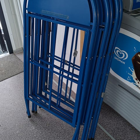 Metallinen tukeva mainosteline, sopii myös ulkokäyttöön, koska on painava. Ruuvit hieman löysällä kiinnikkeissä ja ruostetahrojakin löytynee. Muovit kellastuneet, en ole yrittänyt puhdistaa.