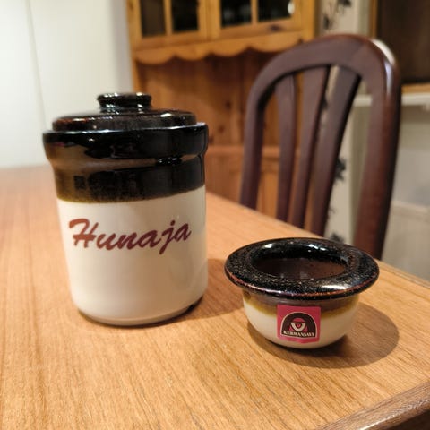 Kermansaven 5 säilytyspurkkia suola, hunaja, sinappi, merisuolaja kalamauste. Hyväkuntoiset vain koristeena hyllyssä.