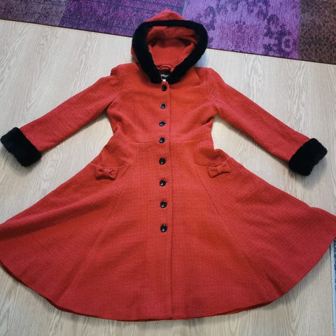 Collectifin musta Alise prinsessatakki -mallinen talvitakki koossa 14/L. Takissa on nappikiinnitys sekä kauluksessa hakanen, leopardikuosinen vuori, kevyet olkatoppaukset ja tekoturkis kauluksessa sekä hihoissa. Takissa näkyy käytön jälkiä kankaan pinnassa ja taskuissa on reiät (ompelutaitoisen helppo korjata), jotka eivät näy ulospäin. Takin kunto on huomioitu hinnassa.
