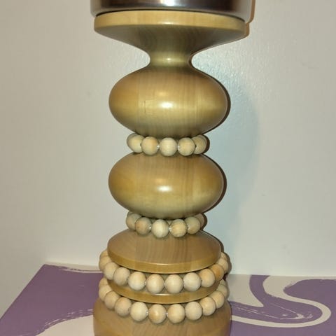 Materiaali: Kynttilänjalka on valmistettu sorvatusta puusta (koivu tai vaahtera) ja siinä on metallinen (alumiininen) kynttiläkuppi.