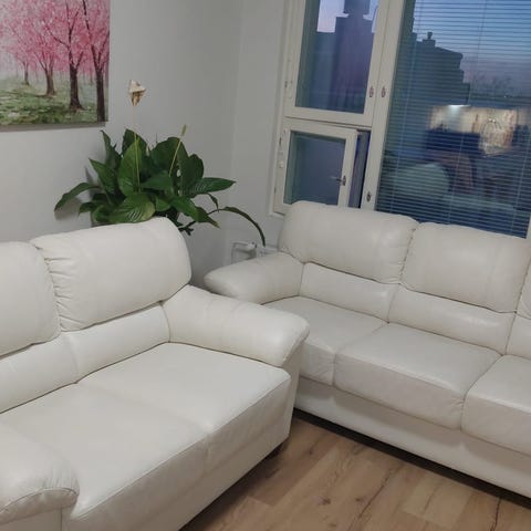 Kaksiosainen nahkainen sohvaryhmä.