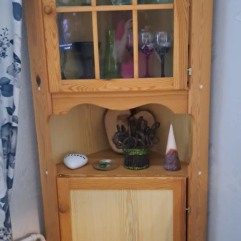 Myydään tilanpuutteen vuoksi näyttävä kulmakaappi. Ollut aikaisemmin 1800 luvun kartanossa. Ei löydä nykyisestä kaupunki kaksiosta paikkaansa.