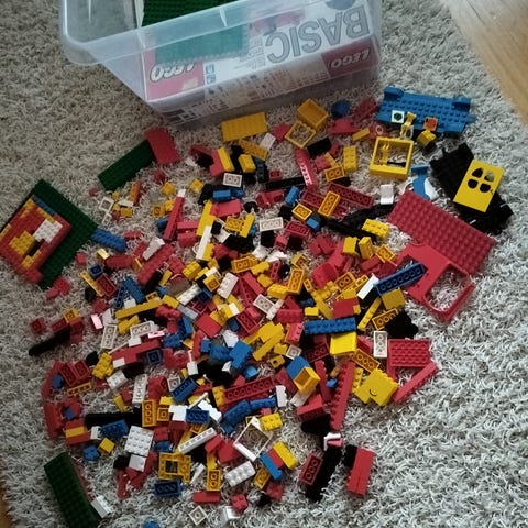 Ikean pahvilaatikollinen legoja. Tässä on todella monesta legopaketista legot. Ohjeita ei ole kaikista tallella ja joistakin paketeista on joku osa hukkukut. Suurin osa uuden veroisia, mutta mukana myös vanhempia legoja. En postita.