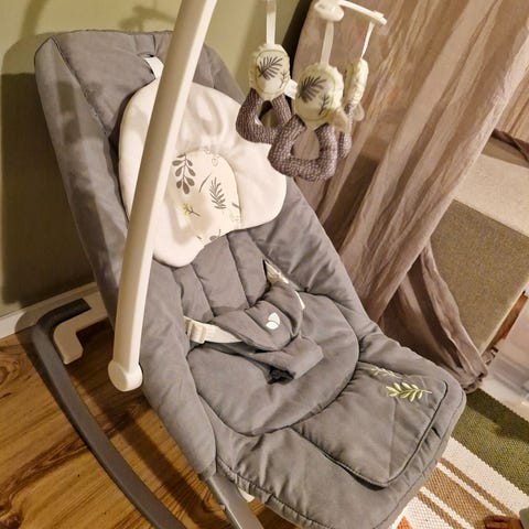 Ergobabyn sitteri, mukana lelukaari. Pehmustettu istuinosa ja turvavyö. Sopii vauvoille ja pienille lapsille. Kevyt ja helposti siirrettävä malli. Irroitettava kangas. Pesty mutta pientä käytönjälkeä näkyvillä.