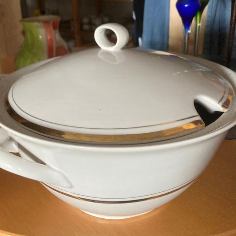Kultakeramiikka tarjoilukulho. Korkeus 6 cm, halkaisija 14 cm. Käytetty, mutta vielä hyvässä kunnossa, ehjä.