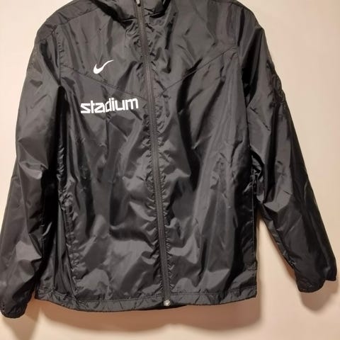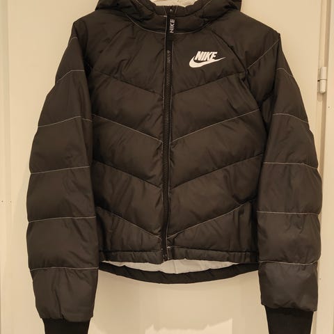 Parhaat päivänsä jo nähnyt Niken untuvatakki. Väri säilynyt tasaisen mustana,vaikka kuva antaa ymmärtää muuta. Hihoissa toppaukset mennyt osin myttyyn. Toisessa hihassa jotain jälkeä ja sisäsauman vieressä rispaumaa (kuvat). Koko 152-170cm.
