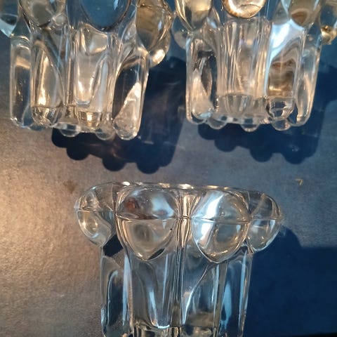 4 kpl ranskalaisen lasitehtaan Reims-kynttiläjalat. Sopivat kruunukynttilöille,myös tuikkuna voi käyttää. 3 e per kpl,10 e 4 yhteensä.