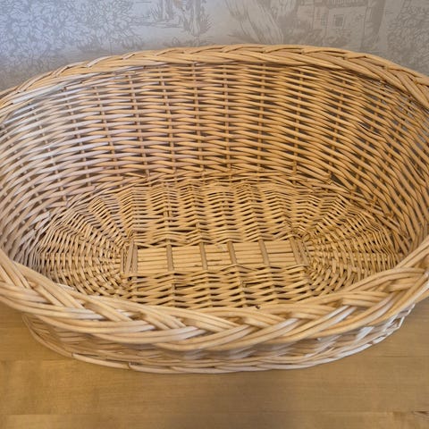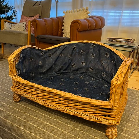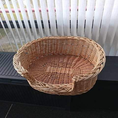 Myydään rottinkinen koiran peti, koko 58*78cm, korkeus edestä 18cm ja takaa 26cm.