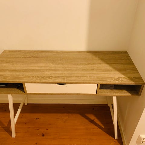 Jykevä työ-/koulupöytä, jossa on mustat metallijalat ja kaksi avointa hyllytilaa pöytälevyn alla. Sopii esimerkiksi työ- tai opiskelukäyttöön.