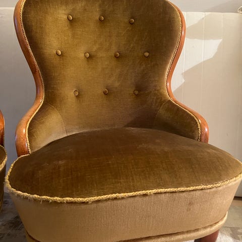 Vanha kaunis Emma-tuoli myytävänä. Kangas aikanaan uusittu. Runko ja istuin ehjä. Selkänojassa hieman löysyyttä ja todennäköisesti jo uutena tehty näin. Ei hajuja. Muutamia vikoja kankaassa ja koriste narussa.