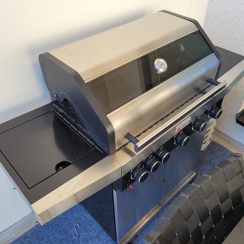 BBQ King kaasugrilli, jossa on musta kansi ja ruostumattomasta teräksestä valmistettu runko. Grilli sisältää lämpömittarin kannessa, kolme säätönuppia ja sivupöydät. Varustettu kaasupullon pidikkeellä ja pyörillä liikuttelua varten.