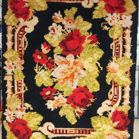 Harvinaisemmalla harmaalla pohjalla Ruusuryijy. Koko 117 × 148 cm + hapsut 30 cm. Hyväkuntoinen ,hajuton,