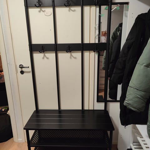IKEA Tjusig naulakko, jossa on hattuhylly ja ripustuskoukut. Leveys 79cm. Väri on valkoinen. Hyvä esim. eteiseen. Ovh.24.99€