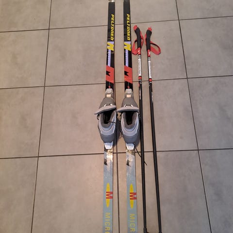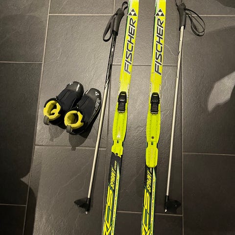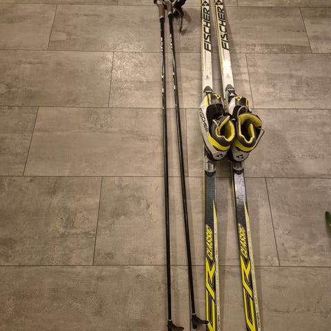 Fischer perinteisen sukset 185cm Salomonin siteillä, Rex sauvat 140cm, Fischer monot 37.