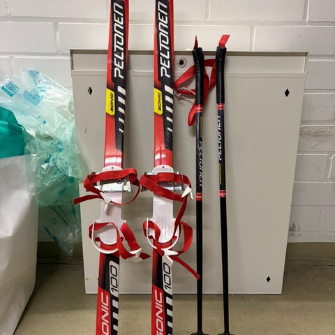 Lasten ensisukset 100 cm ja sauvat 80 cm. Sukset voiteluvapaalla pitopohjalla. Sukset kiinnitetään kenkiin.