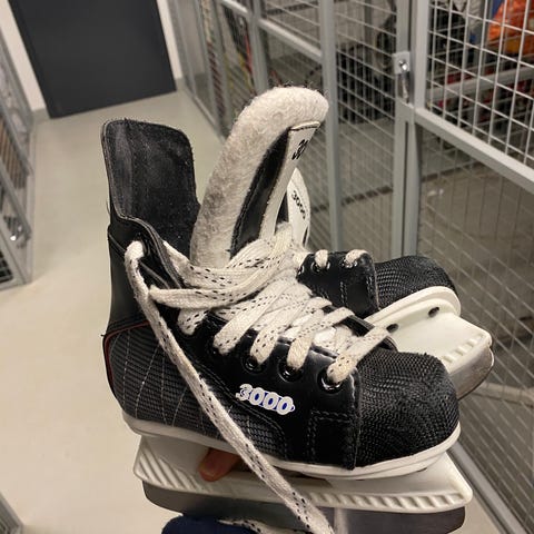 Pikkuiset hokkarit tulevalle maalitykille. Kunto ihan hyvä. Oikean luistimen terässä pientä ruostejälkeä mutta ovat riittävän terävät suoraan käyttöön. Joku jälki pohjallisessa, olisko eväsjuomaa loiskahtanut