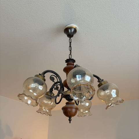 Hieno kärrynpyörävalaisin 7kpl kynttilälamppuja ja 1 iso pallolamppu alapuolella, metrin mittaiset messinkiketjut 3kpl ja 1 ketju keskellä jota pitkin virtajohto n.1,7m