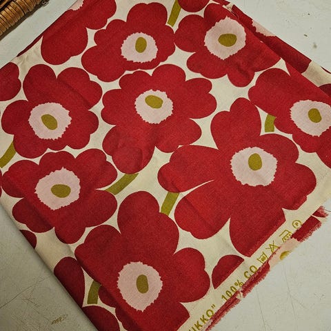 marimekko puuvillasatiini kangas, uusi, vaaleanpunaiset unikot ja kulta kuvio,
