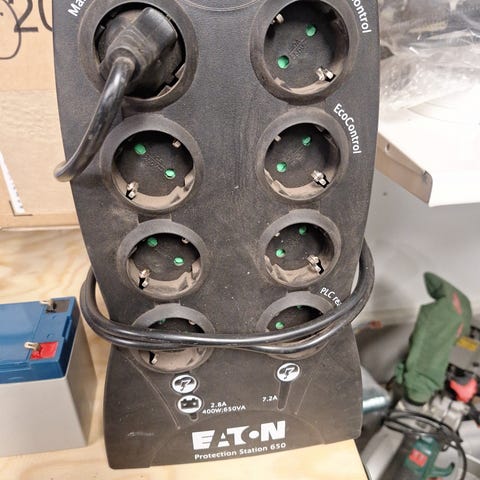 Pölyinen mutta täysin toimiva, akkujen ikä ei tiedossa mutta näytön mukaan kunnossa. Hyvä esim. koti tai yrityskäyttöön. 8kpl jänniteulostuloja (2 kpl group). Liitäntä ulkoiselle akkupaketille jolla kapasiteettia voi kasvattaa. Uuden vastaavan hinta 1250€.