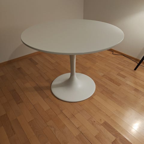 Muuten hyvässä kunnossa, mutta isompi ”lohkeama” pöydässä. Olen itse peittänyt pöytätabletilla, eikä ole näin häirinnyt käyttöä.