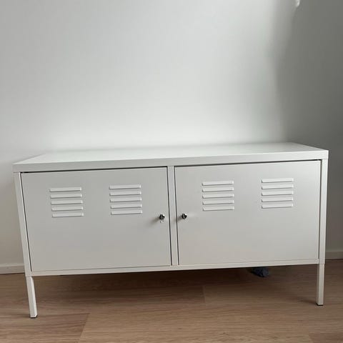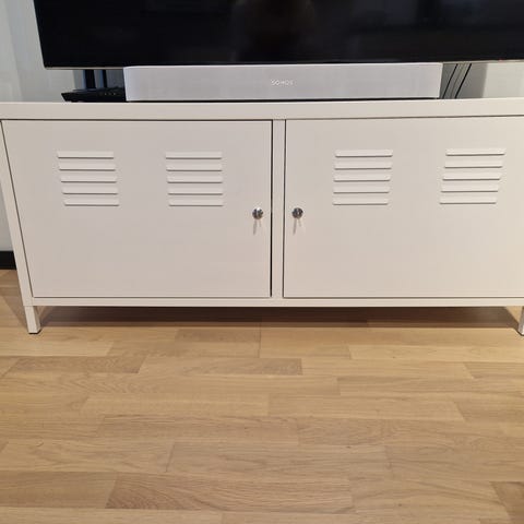 Punainen IKEA PS-kaappi. Metallia, sisällä hyllyt johtoaukkoineen. Avaimet ja lukot toimii.