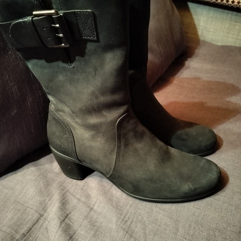Eccon kauniit, pehmeän nahkaiset saappaat kokoa 40. Irtoavan sisäpohjallisen pituus 26,5 cm. Kenkien korkeus noin 43 cm. Sisäpuolella vetoketju. Erittäin vähällä käytöllä olleet, itselle valitettavasti isot. Koiratalous.
