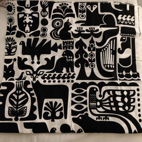 Marimekko verho/kangas, jossa on värikäs "pallokuviointi" punaisella, keltaisella ja vaaleanpunaisella.