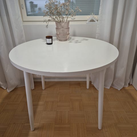 Pyöreä pöytä ja neljä tuolia.