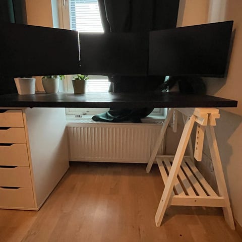 Ikea työpöytä taso / eteisen kenkä teline istuinpenkki. Musta, jossa metalliset jalat ja suorakaiteen muotoinen pöytälevy. Taso ollut käytössä tietokoneen näytön yläpuolella lisätasona. Ostettu toukokuussa 2025 ja ovh 40€. Jäänyt pois uuden pöydän takia. Kunto erinomainen. Pöytä sopii esimerkiksi työ- tai opiskelukäyttöön. NIPÅSEN säilpnk 79x35x52.