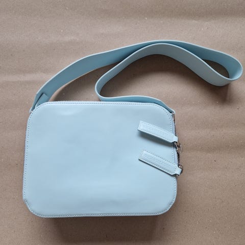 Siisti kuntoinen vaaleansinen Marimekon laukku.