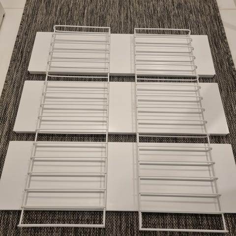 Metallinen hyllykkö 7kpl irroitettavaa hyllytasoa mitä saa myös korkeussäädettyä tarpeen mukaan. Mustat päädyt, valkoiset hyllytasot, kuvissa likainen.