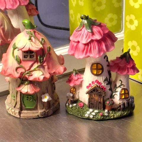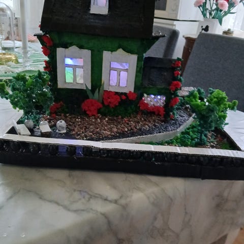 Talo mökki jossa valot pihalla ja talossa sekä pihapiiri