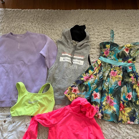 Koko paketti kerralla. 4kpl farkut, 4kpl huppareita, 2kpl collegea, neule, bolero, paitapusero, takki ja tuulitakki. Pari s -kokoista, loput m -kokoisia.