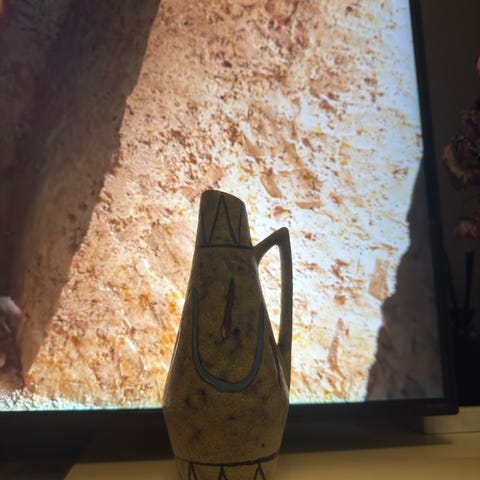 Länsisaksalainen kellertävän ruskea vintage maljakko. Netin mukaan voisi olla 70-luvulta Scheurich Jura.