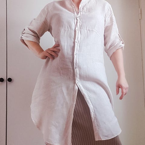 Nätti haalean beige pellavamekko noin kokoa noin XL. Mustat raidat. Edessä napitus, hihoissa mahdollisuus säätää pituutta napeilla. Kangas on hyväkuntoinen, en löydä moitetta. Kai-kai: 65cm, pituus edestä 92cm.