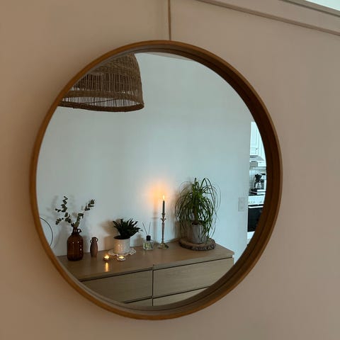 Pyöreä peili puisilla kehyksillä.