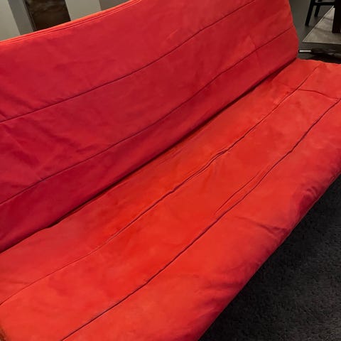 Kuvassa näkyy että laatikko kulunut, mutta sohva käännetty ns toisin päin, eikä tämä estä käyttöä.