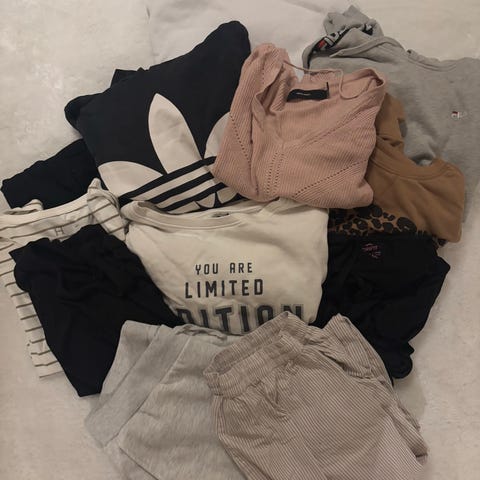 Mekon,T-paitoja,Topin,Farkut,Shortsit ja pitkähihaisia. Lisään tähän viellä jotain kun kaappeja tyhjentelen☺️