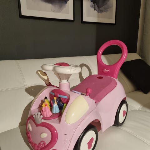 Disney Cars potkuauto punainen. Lasten leikkiauto, jossa on ohjauspyörä ja työntökahva. Pieni pala puuttuu. Sisätiloissa ajettu.
