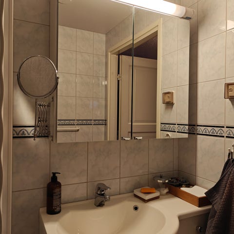 Kolme Puustelli merkkistä valkoista kylpyhuoneen kaappia, joissa on lasihyllyt ja puiset ovet. Yksi peili kiinnikkeillä.