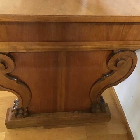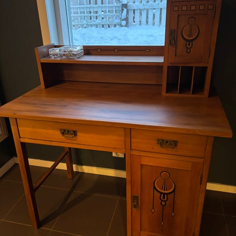Myydään tamminen kirjoituspöytä, kotimaista tuotantoa. Ulkomuodollisesti pöytä edustaa myöhäisjugendia eli 1920-lukua.