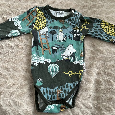 Muumibody 56 koossa. Pesty hajusteettomalla pesuaineella, koiratalous.