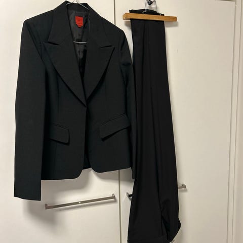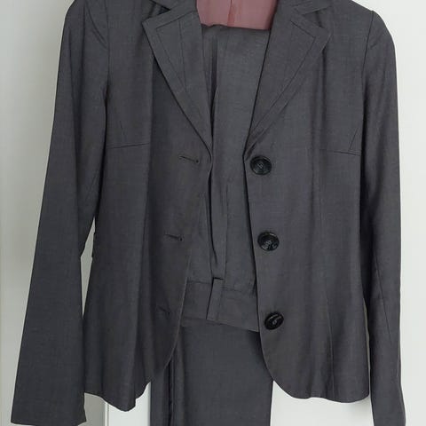 Harmaa naisten jakkutakki & housut, koko 34. Materiaali mukava päällä. Molemmissa materiaalina käytetty osittain silkkiä.