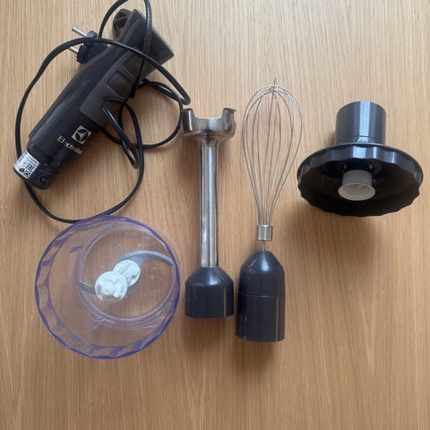 Lähes käyttämätön sauvasekoitinsetti. 600 W tehoinen sauvasekoitin ruostumattomasta teräksestä. Settiin kuuluu myös silppuri, mittallinen sekoituskulho, vatkain sekä seinäteline.