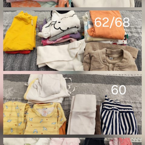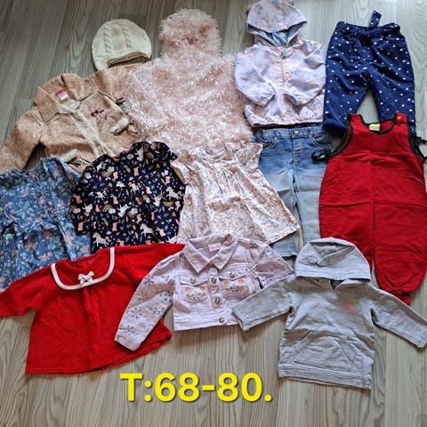 Noin koon 68-74 vaatteita. Sivulla yksi on vasemmalla bodyt, keskellä mekot ja oikealla yöpuvut. Sivulla kaksi on vasemmalla paidat, keskellä collegepaidat/hupparit ja oikealla leggingsit/housut. Sivulla kolme lisää vaatteita, jotka muistin vasta jälkeenpäin.