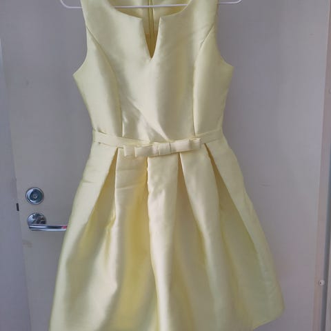 Myydään sitruunankeltainen mekko kokoa 36. Merkki NLY EVE. Halterneck kaulus, polvipituinen, takana vetoketju ja kaulassa kaksi nepparia. hyväkuntoinen, 3 juhlissa käytetty.
