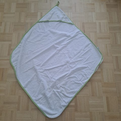 Liberon vihreä huppupyyhe. Kahdella käytetty. Parista kohdasta vähän purkautunut (katso kuvat). Ei eläimiä, hajusteeton pesu.