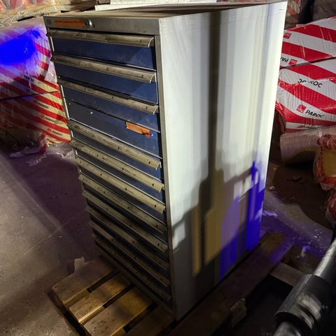 Varastokäytössä ollut kunnollinen metallikaappi, metallihyllyillä