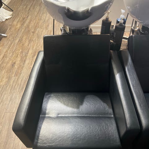 Kaksi kampaamon asiakastuolia, toisessa on virhe istuinosassa. Ei haittaa käyttöä mitenkään. Toisessa ei moitteita. Puhdistusta kaipaavat molemmat. Hinta molemmista yhteensä.
