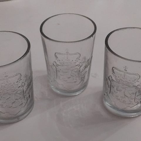 Kuvanmukaisia kirkkaita vaakunalaseja, joissa pohjassa himmeällä notsjö koholeima. Hyväkuntoisia ja siistejä. Hieman sirompia kuin vihertävät kollegansa.